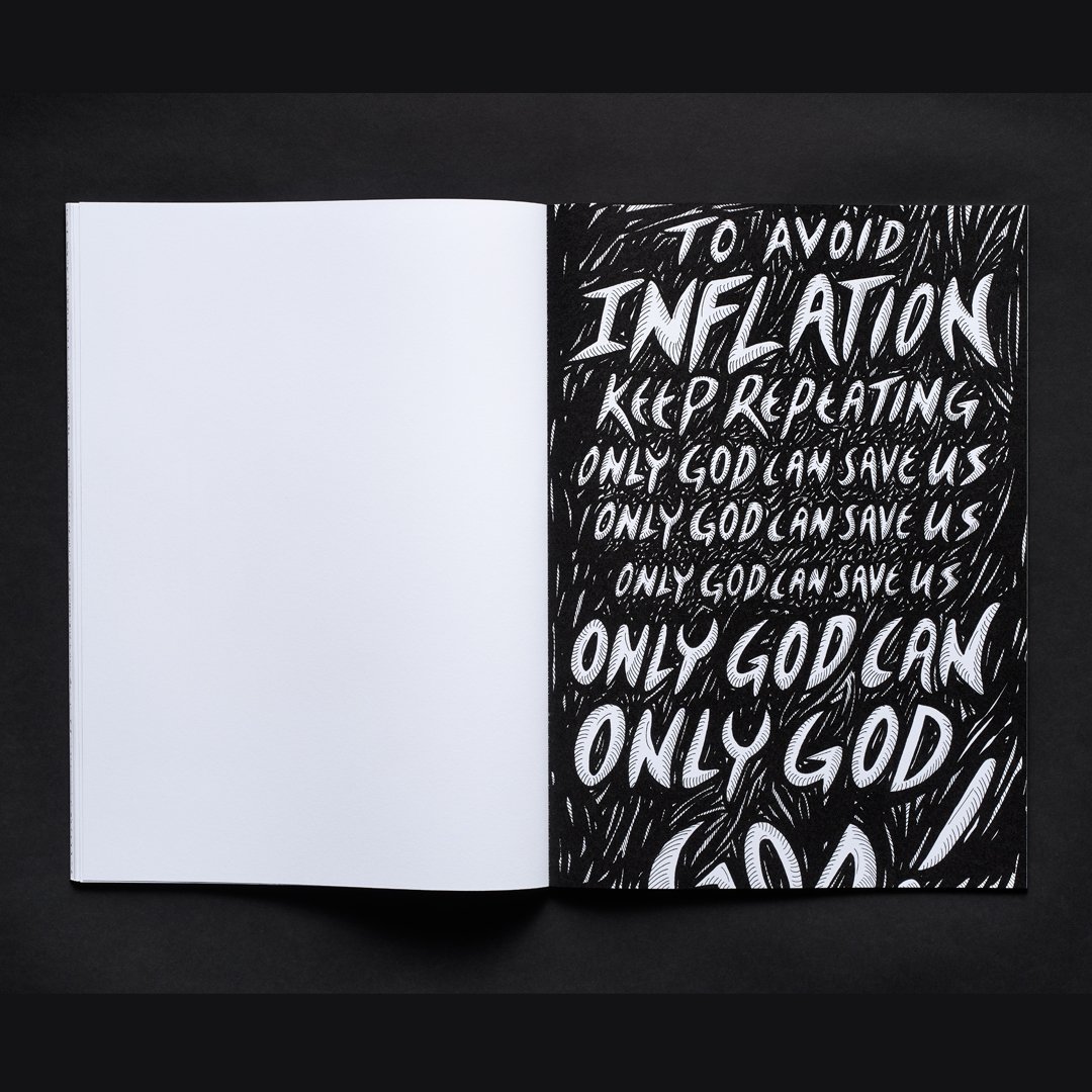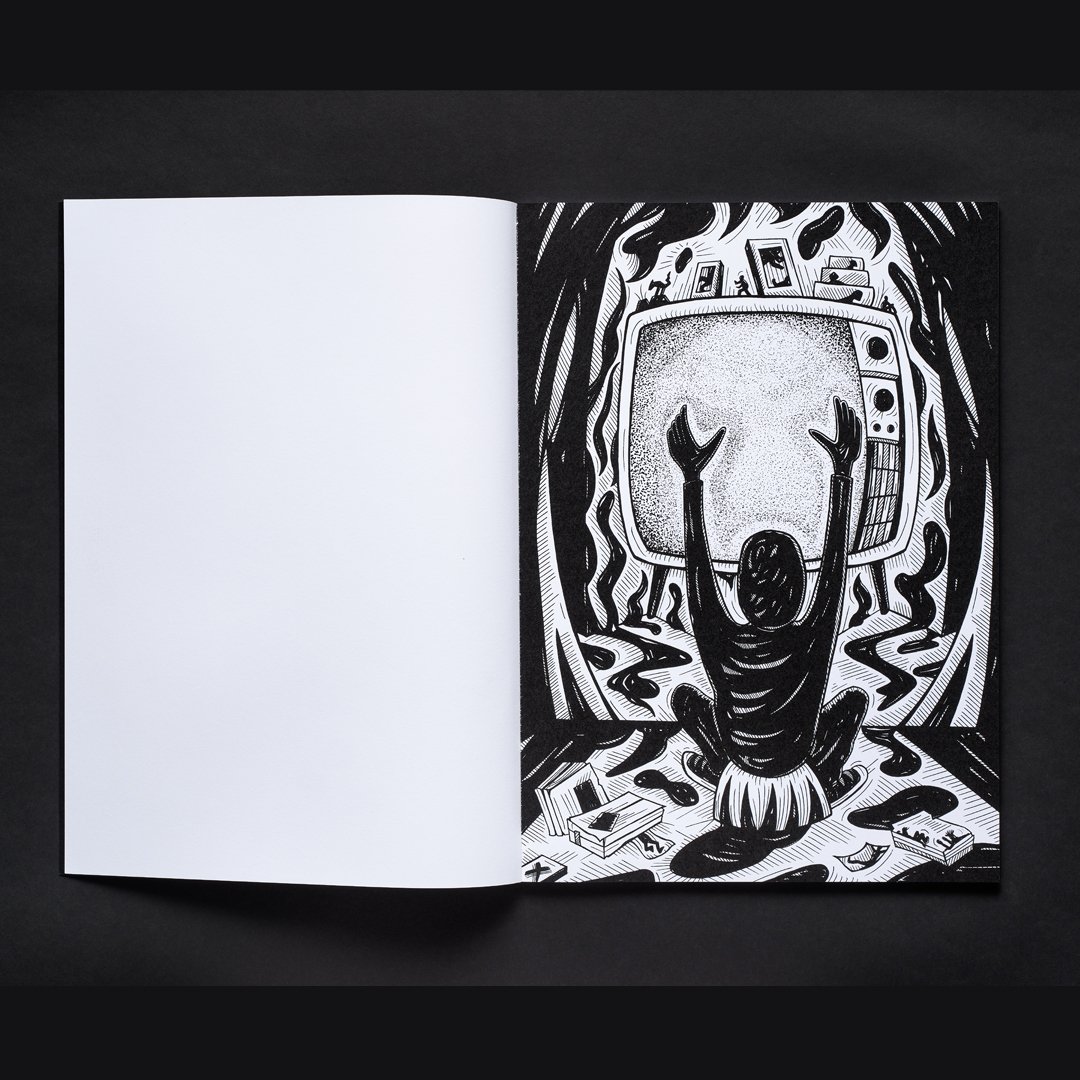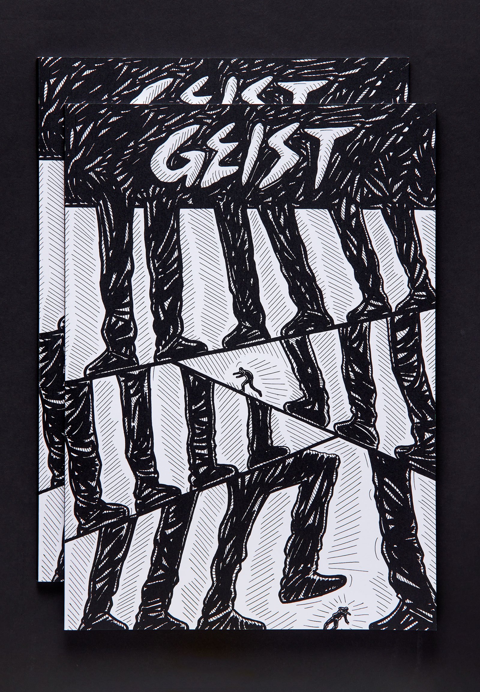 Loosely inspired by the visual language of the seminal horror films Poltergeist and The Last House on the Left, this book of stark black-and-white drawings follows a fractured character’s shadowy and disorienting journey through entrenched socio-cultural, political, and economic structures. In Geist, reality unravels like a waking nightmare.